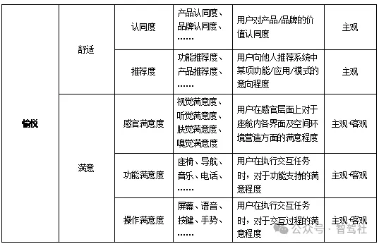 满意是用户综合体验的关键评价指标,反映用户在使用座舱产品过程中和过程后对于感官、功能和操作三个方面的满意程度。按照愉悦感来源, 满意度可主要划分为感官满意度、功能满意度、操作满意度。感官满意度是用户在感官层面上对于座舱内各界面的满意程度,主要考察用户的视觉、听觉、肤觉、嗅觉和体感的体验,对座舱空间、造型、色彩材质工艺(CMF)、灯光、温度、湿度、声音、气味等多个方面进行多维度评价。功能满意度是用户使用座舱产品提供的功能满足自身需求时,对于特定功能执行效果的满意程度。操作满意度是用户在执行交互任务时对于交互中操作过程的满意程度。功能满意度指标和操作满意度指标能够在静态满意度测评的基础上对用户在交互过程中的动态满意度进行评价。