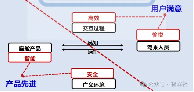 以技术引领和应用规范为目标,从人-机-环融合的角度对智能座舱进行综合评价。人-机-环系统的组成:驾乘人员(人),座舱产品(机),交互过程(人-机), 广义环境(环)。智能座舱综合评价主要考虑两个角度,既要从功能服务的角度评价智能座舱产品的先进性,又要从用户体验的角度评价座舱是否让用户满意。