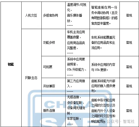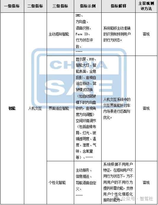 但是也应当看到:智能座舱综合评价框架体系的构建尚处于从 0 到 1 的过程,突出综合性、全面性和准确性,力求打造行业在开展智能座舱测试评价时,可自定义、模块化选用的“百宝箱”;安全、智能、高效、愉悦共同诠释了智能座舱的内涵,其中安全、智能和高效维度承接于智能座舱分级, 愉悦是座舱智能化技术向消费者传递的情感价值的体现;在对智能座舱进行整体评价时,对于相关指标的选择还要注意到部分指标存在交叉验证和佐证的关系,未能完全互斥;鉴于智能座舱技术进步日新月异,行业创新实践不断涌现,在保持综合评价一级二级指标稳定性的同时,对三级及以下指标保持开放性,做到可持续迭代升级。