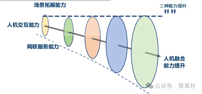 人机交互能力代表着智能座舱感知、理解并做出相应决策服务驾乘人员的能力,网联服务能力代表着智能座舱为驾乘人员提供丰富功能和服务的能力,场景拓展能力代表着智能座舱服务驾乘人员边界的拓展能力(从驾驶员到驾乘人员, 从舱内到舱内外)。人机交互、网联服务和场景拓展三种能力相互支撑,共同促 进智能座舱整体服务驾乘人员能力的提升。