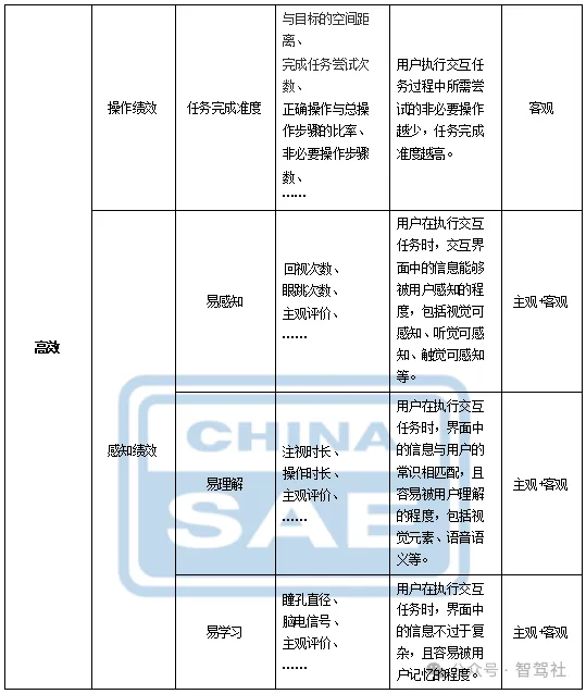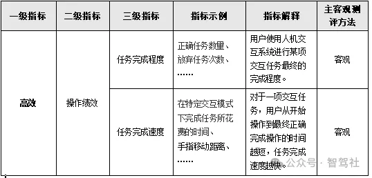 高效维度的指标主要参考“ISO-9241-210 人机系统交互工效学标准”交互可用性中的绩效(effectiveness)和效率(efficiency)。其中,绩效包含准确性和完整性,效率包含用户完成任务所需资源。因此, 将高效维度的指标分为主要采用客观评价的操作绩效和可同时采用主观和客观评价的感知绩效,操作绩效和感知绩效两个二级指标分别对应上述标准中的绩效和效率,二者又可以同时作为彼此的补充和验证指标。