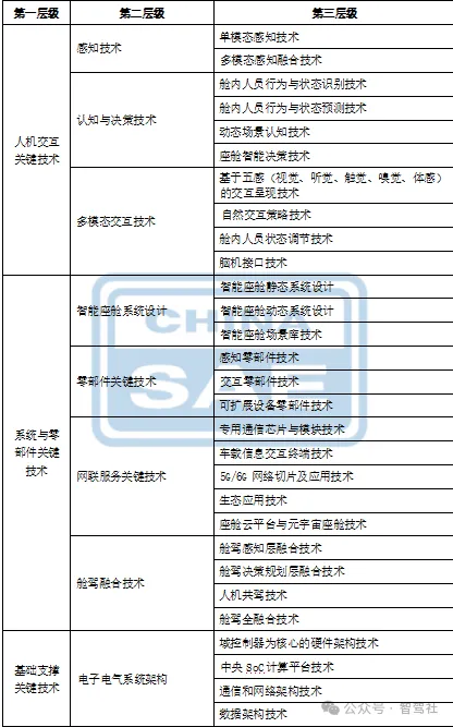 近年来,作为容易被消费者感知的“第三空间”,众多整车制造、科技公司、 信息通信企业、新型供应商等都在加大智能座舱的研发投入与商业应用, 技术快 速迭代、新技术新应用层出不穷。智能座舱是既有理论问题, 也有技术问题,还有产品问题的研究领域。从用户需求出发,梳理下一代智能座舱领域的关键技术,针对性基础问题进行产业协同,建立产业生态是智能座舱领域进一步快速发展的紧迫要求。为此,智能座舱白皮书在进一步研判技术演进路径和商业应用时间的同时,将技术体系架构在人机交互关键技术、系统与零部件关键技术、基础支撑关键技术基础上,进行了第二层级与第三层级子领域技术分解研究,如表 2-2 所示。