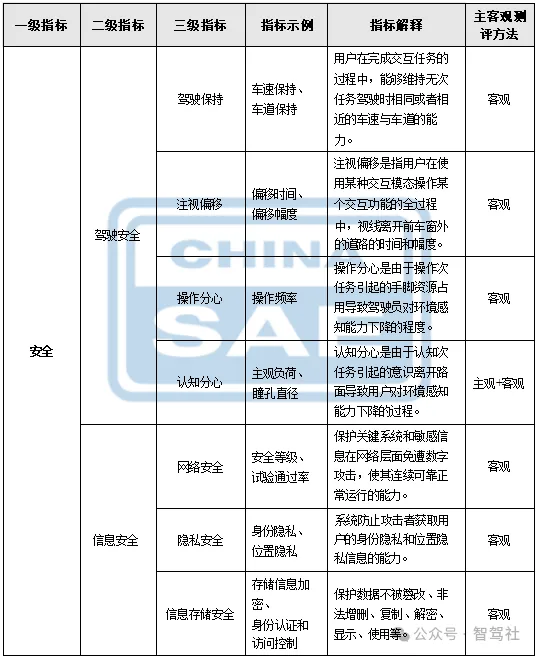智能座舱安全维度主要包括驾驶安全和信息安全。驾驶安全是指驾驶员一边执行驾驶主任务,一边执行座舱交互系统次任务时,座舱交互系统具备的减少驾驶分心、正确实现相应功能、提高行车安全的能力。智能座舱的驾驶安全在座舱交互系统评价中具有特殊性,其所评价的并不仅仅是人机交互系统本身,而是这套人机交互系统协助驾驶员完成驾驶次任务的过程中,对于另外一组驾驶主任务的影响。如何平衡好驾驶次任务与驾驶主任务的关系,是座舱交互设计与评价所面临的主要挑战。