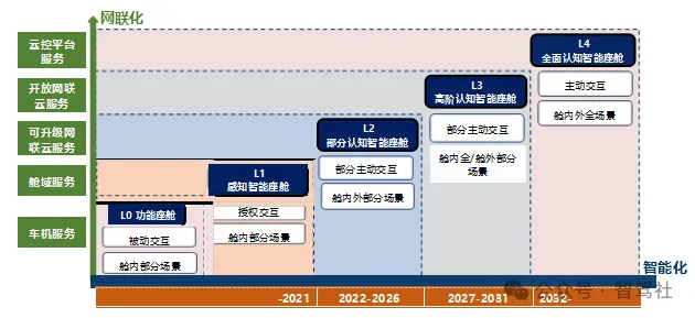 表述:任务可跨舱内外部分场景执行;座舱具备舱内全场景主动感知驾乘人员的能力,任务可部分主动执行;具备开放的网联云服务能力。