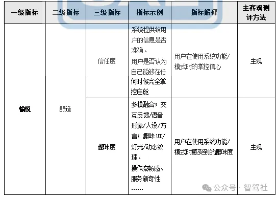 舒适主要反映用户在使用座舱产品过程中和过程后产生的情绪体验,可划分为信任度、趣味度、认同度和推荐度等三级指标。信任度是用户在使用座舱系统功能或模式时的信赖程度。趣味度是用户在使用座舱系统功能或模式时感受到的趣味程度,包括对功能本身、操作方式和交互内容等多方面的趣味认可程度。认同度主要反映用户对于整个座舱产品和品牌的认同程度。推荐度能够反映用户向他人推荐系统中某项功能、应用、模式的意向程度。