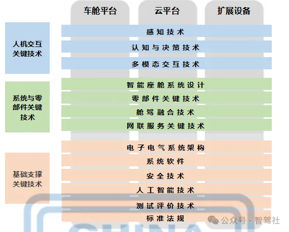 智能座舱涉及汽车、人机交互、信息通信、人工智能等多领域技术和多学科 交叉,其技术架构较为复杂,可划分为“三横三纵”式技术架构。“三横”是指智能座舱主要涉及的人机交互技术、系统与零部件关键技术和基础支撑关键技术,“三 纵”是指支撑智能座舱发展的车舱平台、云平台和扩展设备,如图2-2 所示。