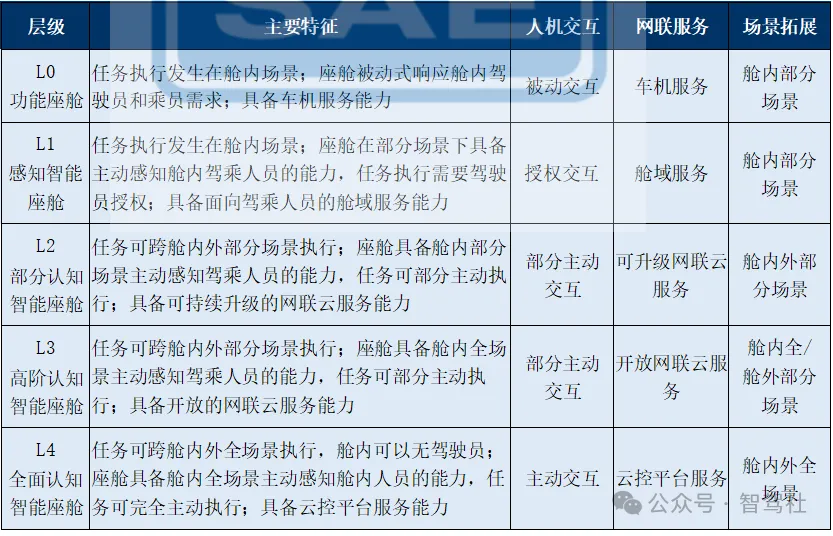 以技术引领和应用规范为目标,从人-机-环融合的角度对智能座舱进行定义 分级。智能座舱的核心是更好的服务驾乘人员, 对智能座舱各个等级所应具备服务驾乘人员的能力进行划分:明确每个级别座舱的人机交互能力、场景拓展能力、 网联服务能力。(1)人机交互能力:座舱对舱内人员的感知从被动到主动,座舱任务的执行从授权执行到主动执行;(2)网联服务能力:从车机服务,到车舱服 务、可升级网联云服务,再到开放网联云服务,最终实现云控平台服务的连接; (3)场景拓展能力:由舱内部分场景到舱内全场景,由舱外部分场景到舱外全场景。确定从“功能座舱”到“全面认知智能座舱”的五个智能座舱级别,该表格所描述的仅为每个级别应具备的最低能力。