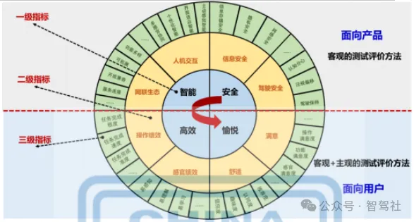 本项报告研究同时提出了汽车智能座舱综合评价指标体系与评价方法。评价体系从产品和用户体验两个角度综合考虑,包括安全、智能、高效和愉悦四个一级指标。安全和智能主要用于评价座舱的产品先进性, 高效和愉悦主要用于评价用户体验。本评价体系为智能座舱测评提供了方向性、框架性的参考和指引,对三级及以下指标保持开放性,做到可持续迭代升级。