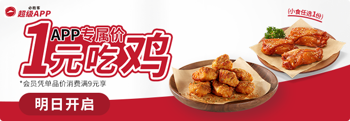 【活动时间】2024年11月26日【如何参与】活动期间,必胜客 APP 会员可在APP-我的卡券内查收”APP 周二尖叫1元购指定商品一份(单品价消费满9元)“优惠券1张,凭券以单品价任意消费满9元即可以1元选购指定小食一份(指定商品为必胜香香鸡中份(椒盐/热辣孜然)、炙烤香骨鸡(3只装)(蜜制酱烤/新奥尔良))【券有效期】本优惠券仅 2024年11月26日当天有效,具体使用规则请以券详情说明为准;电子券到期未用即自动失效。【其他须知】本活动不适用于机场火车站、高速公路、旅游度假、游乐场、展览馆、奧特莱斯、精选餐厅、LesEltes 、必胜客WOW乐享店、Pizzeria以及部分必胜客特定餐厅,请详洽餐厅,用户对本活动有任何问题或建议,请咨询必胜客在线客服,在线客服工作时间(09:00-21:00)。