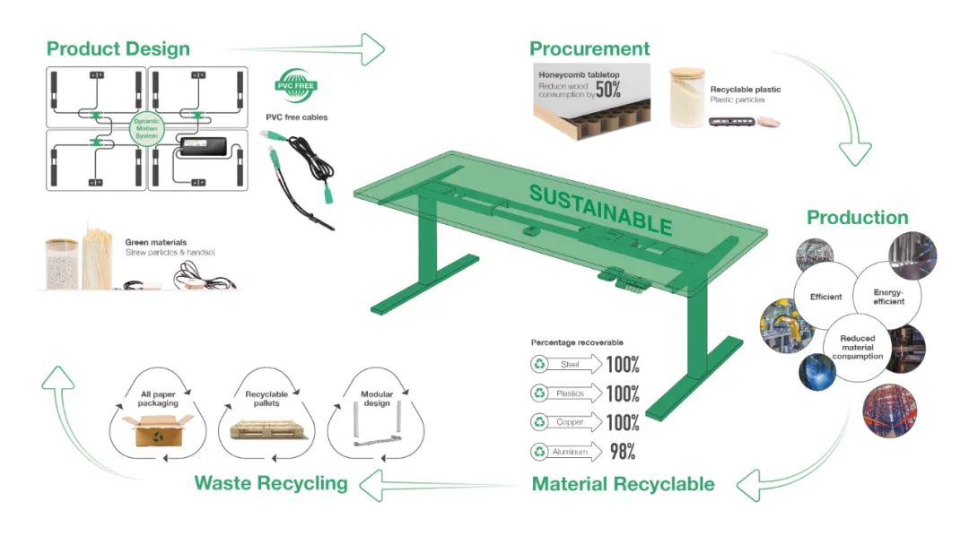 我们的产品在设计之初就充分考虑到环保材料的使用与资源的高效利用,以减少对环境的影响。在制造阶段,我们采用先进的生产工艺,努力实现绿色制造,减少能源消耗和废物产生。此外,在产品使用过程中,我们的升降桌设计注重耐用性与功能性,以延长产品生命周期,从而降低资源浪费。