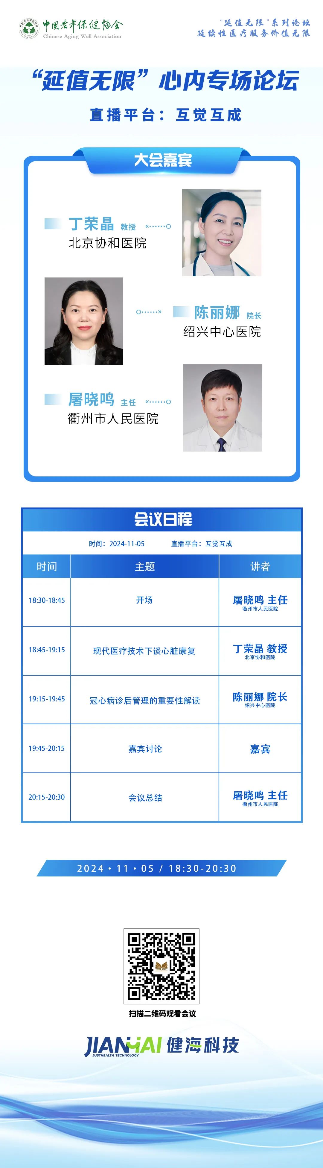 为更好地贯彻落实文件精神,延值无限系列论坛第三期特设“心内”专场论坛,特邀北京协和医院丁荣晶教授、绍兴中心医院陈丽娜院长、衢州市人民医院屠晓鸣主任,深度讲授现代医疗技术下的心脏康复与冠心病的诊后管理之道,诚邀您参与,与一线专家大咖共话“心”篇。