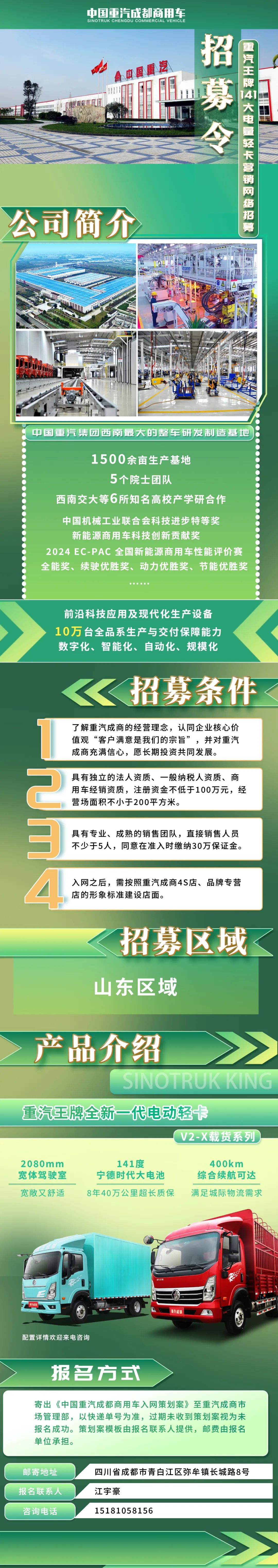【招募令】重汽王牌141度大电量轻卡营销网络招募启动!