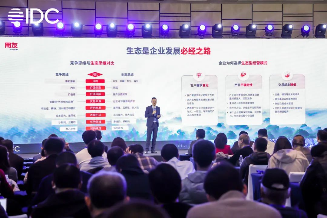 峰会从IDC全球化渠道生态体系建设洞察出发,同与会嘉宾共同探讨了在宏观经济、技术和行业转型等多重因素影响下,如何通过AI和数据结合的解决方案重构生态格局。用友网络副总裁董波作为代表出席峰会颁奖仪式,并发表了题为《领航企业数智化,融创产业新生态》的主旨演讲,深入解读了当前企业服务软件及生态发展趋势。