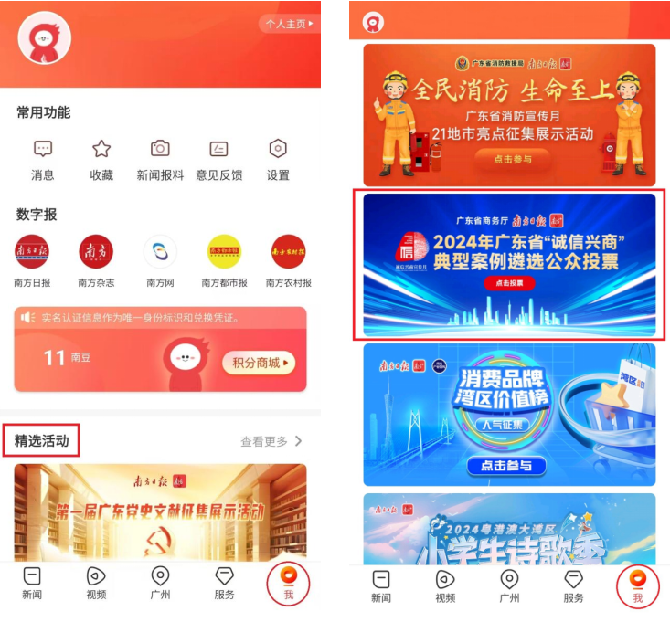 打开“南方+”客户端,点击底部导航栏的“我的”,在“精选活动”专区即可找到“2024年广东省诚信兴商典型案例投票”入口,为9号广东省建筑科学研究院集团股份有限公司投票。