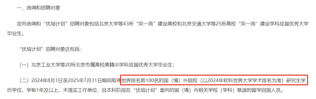 根据北京市公布的2025定向选调和“优培计划”的毕业生公告显示
