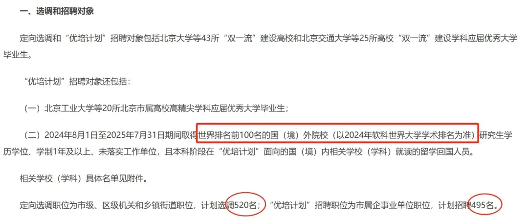 2025年,北京的定向选调名额为520名,比去年扩招60名;“优培计划”招聘职位为市属企事业单位职位,计划招聘495名。