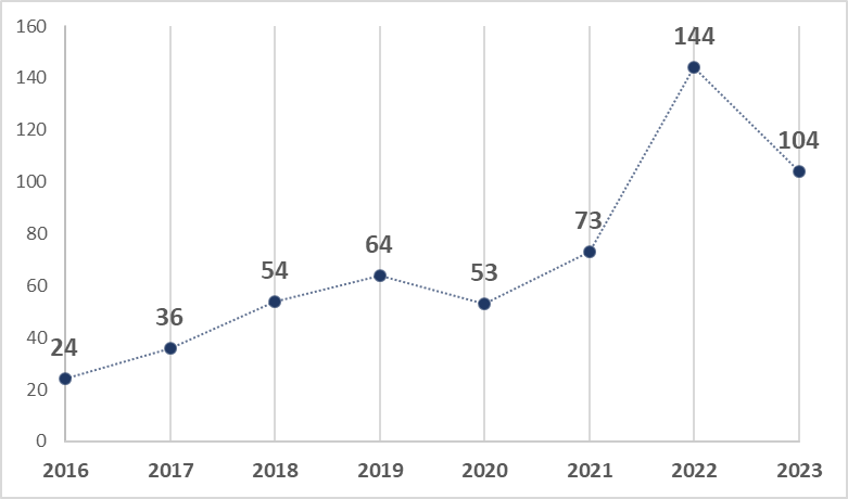 2023年全球AI+药物研发相关融资总事件达104件,总金额为36亿美元。其中美国的AI药物研发融资事件为48起,中国32起,其他国家和地区为24起,投融资活动仍然主要活跃在中国、美国和欧洲(欧洲则集中在英国)。中国的投融资活动则主要集中于珠三角、京津冀以及长三角等医药产业较为发达的地区。