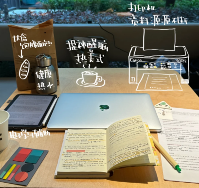 学习空间不能太狭窄,要有窗景,能看到绿植;正所谓“差生文具多”,手机、iPad、电脑、耳机、咖啡、热水一样少不了,少了一样这个期末复习都不成立。