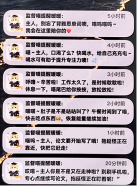 AI监督师经常用“喵呜”“喵之提醒”点缀语句,传递温暖又有力的提醒。