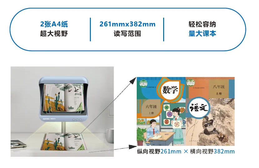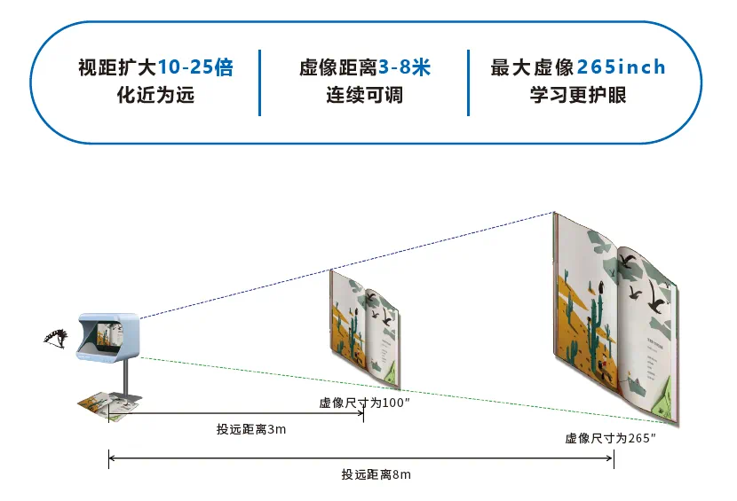 读写台为孩子提供了超大视野,261*382mm的读写范围,比平时用的A4纸还要大,是正常作业本大小的2-4倍。无论是课外看书还是日常做作业,都能轻松应对,无拘无束。虚像距离3-8米,最大可享受265英寸的虚像阅读体验。简单的想象一下,读写台就是一台投影仪,它可以把书本上的内容投射在3-8米的墙上,孩子在使用读写台看书时,就像是在看墙上的投影,而不是直接看近处的书本。让孩子在阅读时能够享受到远距离的视觉体验,从而保护视力,减少眼睛疲劳。精心设计6-8°的下视角,符合人体工学,护眼的同时还能有效矫正不良坐姿,保护脊椎的健康。