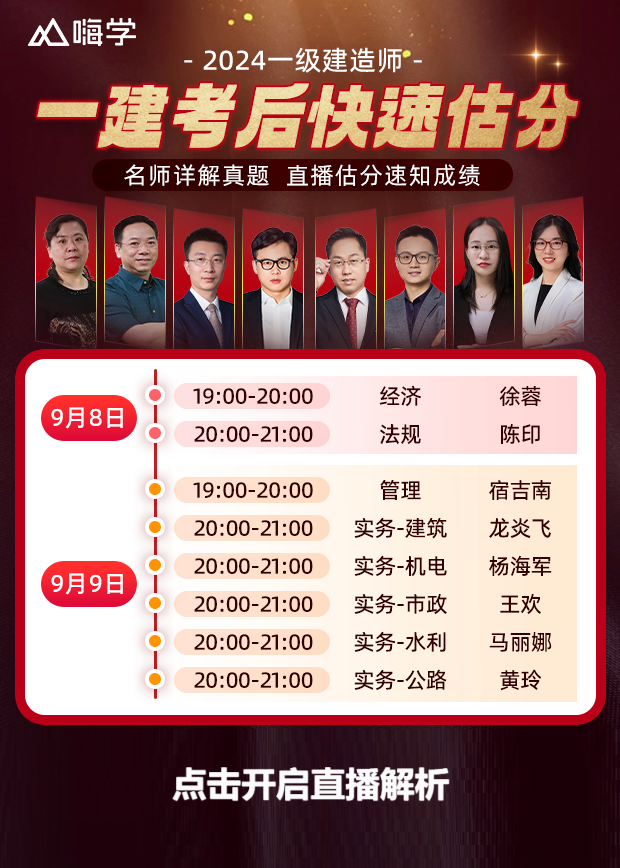 走出考场之后,一定要记得锁定嗨学,锁定嗨学课堂!嗨学名师详解2024回忆版真题答案,带给你超迅速的估分体验。9月8日-9月9日晚19点!2024年一建考后真题解析直播!赶紧来对答案,估分预约上岸!