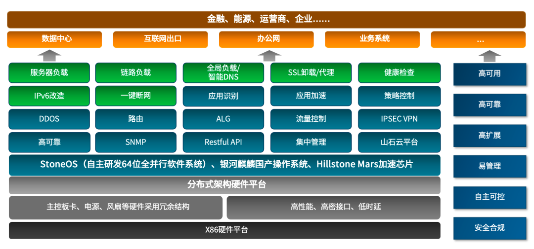 自主可控:基于海光处理器,搭载银河麒麟操作系统,采用自主研发的软件系统和Hillstone Mars加速引擎,实现从硬件到软件自主研发,全程安全可控。