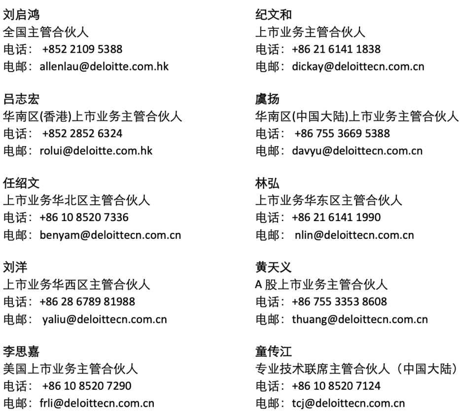 如欲了解资本市场服务部的活动信息,请联系项目团队:高级经理陈姿桦(电话:+852 2852 1679,电邮:bonchan@deloitte.com.hk)或经理於弘嘉(电话:+86 21 6141 1478,电邮:doryu@deloitte.com.cn)。