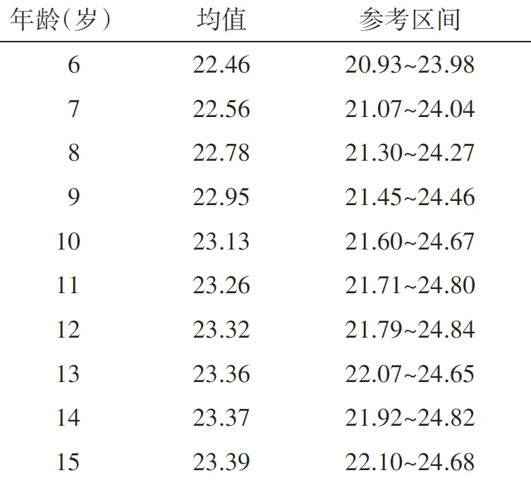 6-15岁学龄儿童眼轴长度参考区间(单位:mm);数据来源:《中国学龄儿童眼球远视储备、眼轴长度、角膜曲率参考区间及相关遗传因素专家共识(2022年)》
