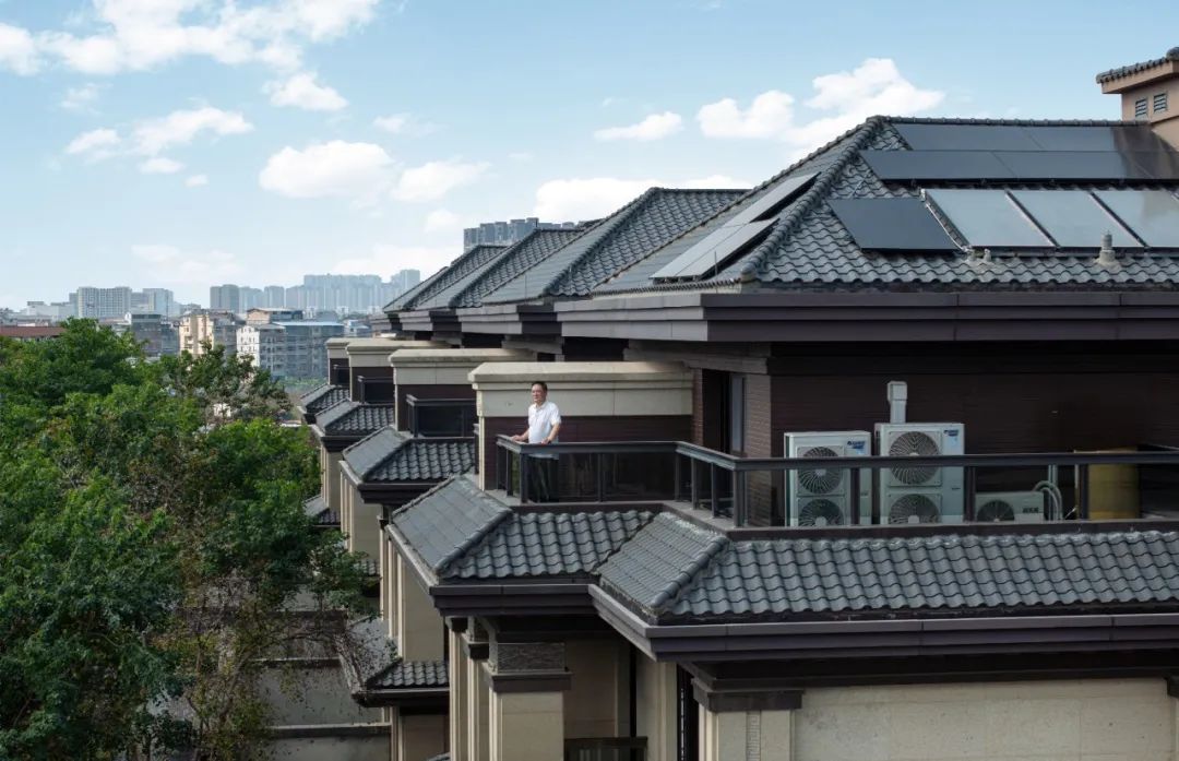 高颜值也是舒适美。在这栋五层别墅屋顶上,黑色光伏低调融入建筑,多角度鸟瞰美观无死角;在室内,纯白逆变器、储能柜丝滑“嵌入”墙壁一角,不额外占用空间,不打破色调平衡,包裹隐藏走线彰显和谐统一的细节巧思。