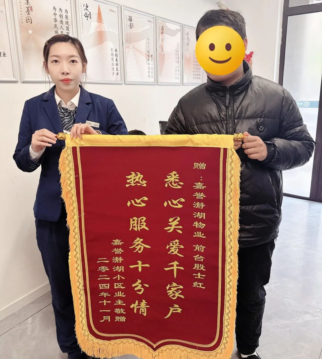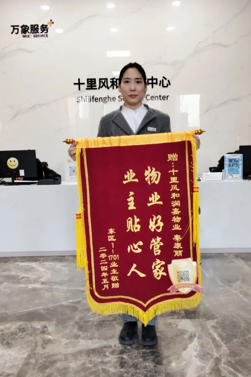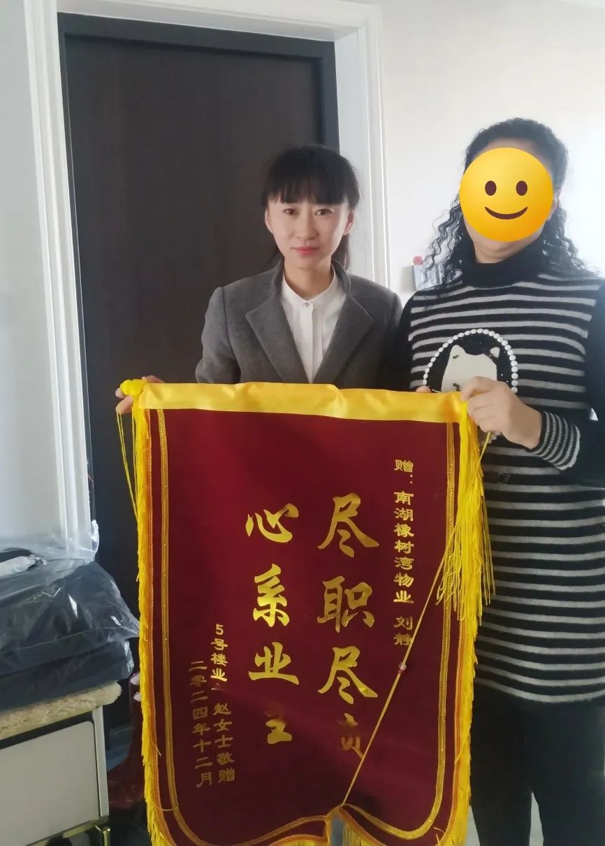 这一系列周到、暖心的服务,深深打动了业主的心。业主特意定制锦旗,亲手送给殷世红,以表达对物业服务的认可与称赞。