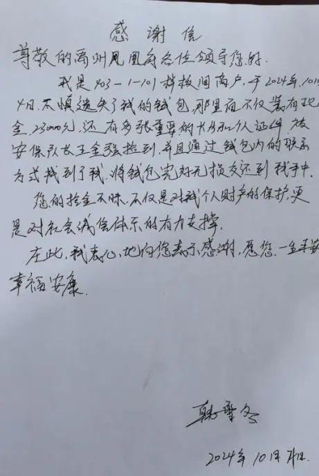 几天后,该商户不仅专程送来一面锦旗,还亲笔写了一封感谢信,表达内心的感激之情。