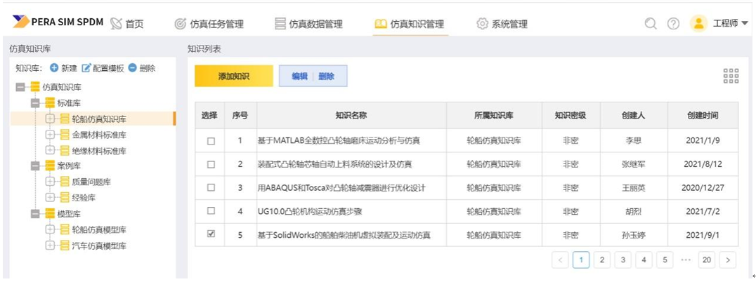 提供可配置的仿真知识库,可分类管理各类仿真知识,包括仿真流程模板、仿真规范、仿真案例、仿真材料库、工况库、仿真模型库等,通过任务与知识的关联在仿真任务中直接参考或使用知识内容。