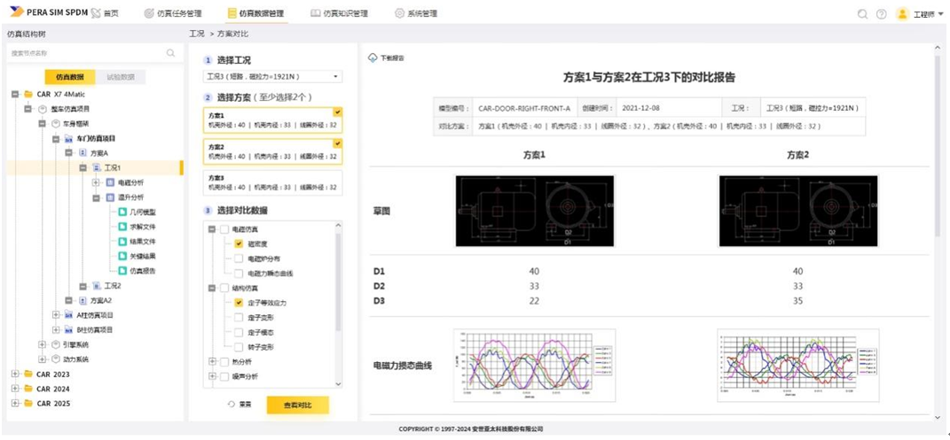 提供多方案对比分析向导,能够选择同一型号某工况下的不同方案进行对比分析。系统自动生成不同工况下不同方案的对比报告,直观查看由于工况不同引起的仿真分析结果的差异。