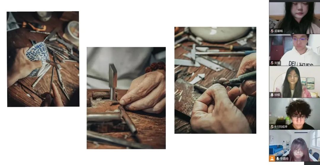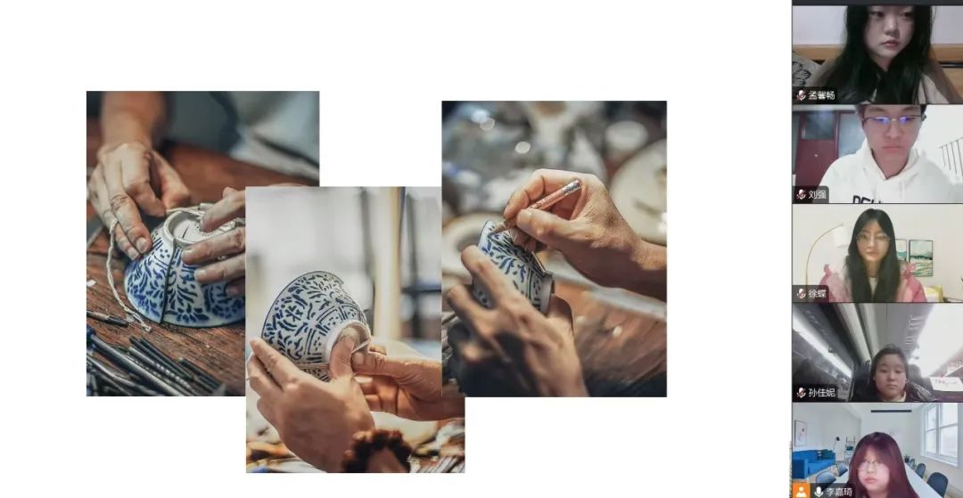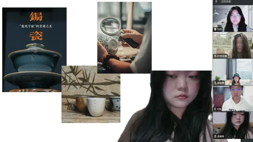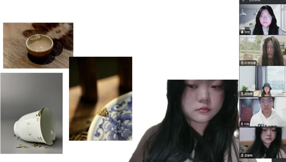分享开始,孟馨畅同学向我们介绍了锔瓷始于宋代,《清明上河图》中就有街边锔瓷的场景。历经宋、元、明、清、民国、新中国六个朝代。清朝乾隆盛世时,分为以民间生活用品为主的粗活和为达官贵人服务的细活“锔活秀”。