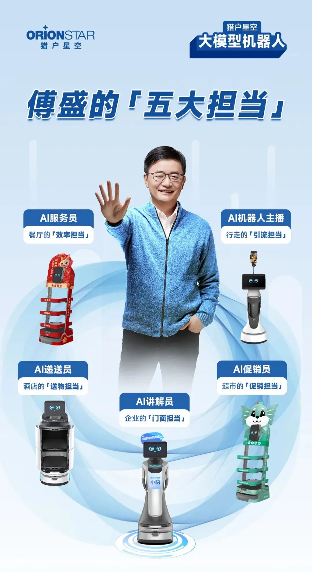在系统性定义「大模型机器人」标准的同时,猎户星空董事长傅盛正式推出AI时代的「五大担当」,基于展厅、餐厅、直播店铺、超市、酒店五个核心应用场景,紧密结合客户需求,打造“真有用”的「大模型机器人」产品。