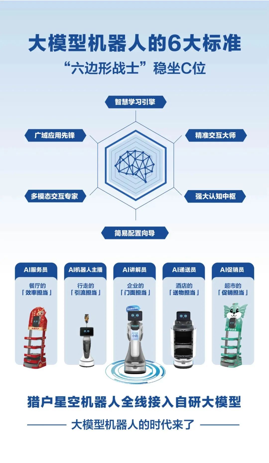 与传统的自动化机器人不同,「大模型机器人」有能力「身兼六职」,充当智慧学习引擎、精准交互大师、强大认知中枢、简易配置向导、多模态交互专家、广域应用先锋。这样的「大模型机器人」不仅能成为企业降本增效的得力助手,还是拥有智能“大脑”的专业伙伴,随时变身「六边形战士」,全面赋能企业实现智能化升级。