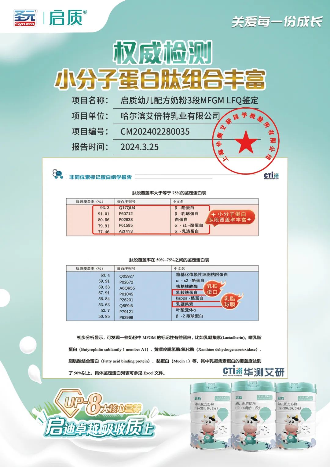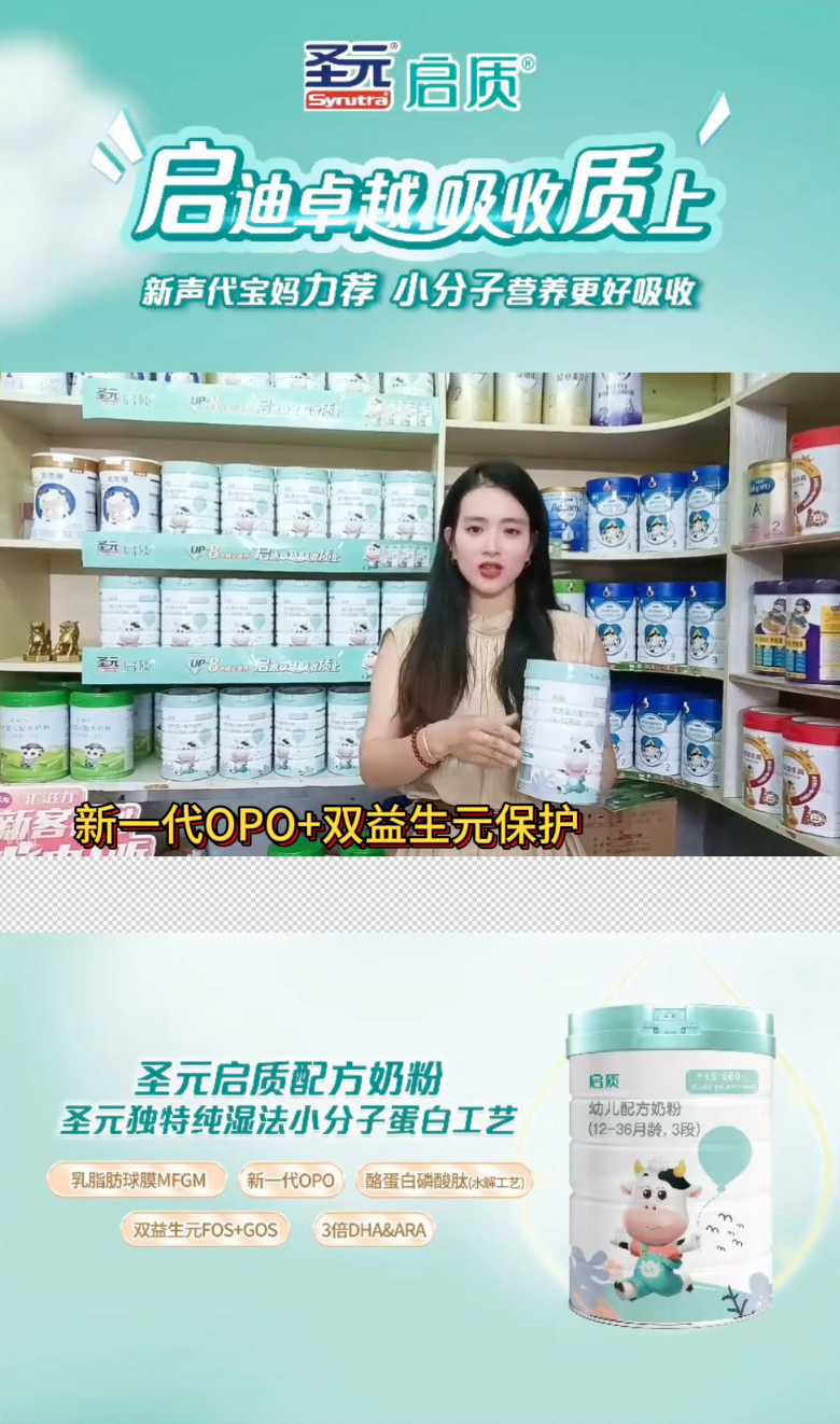新国标圣元启质,在配方设计上,主打小分子蛋白配方;特别添加了易消化和吸收的小分子物质:新一代OPO,含量高达4.8g/100g;酪蛋白磷酸肽CPP活性肽,36mg/100g;新一代乳脂肪球膜MFGM,以及3倍DHA&AR、4.7倍胆碱、核桃油、等臻稀营养成分,权威检测报告实证(华测艾研)圣元启质初源营养中优质的小分子蛋白肽段的丰富性,低敏亲和好吸收,减少宝宝肠胃负担,提升优质营养在体内吸收率,全维守护宝宝。