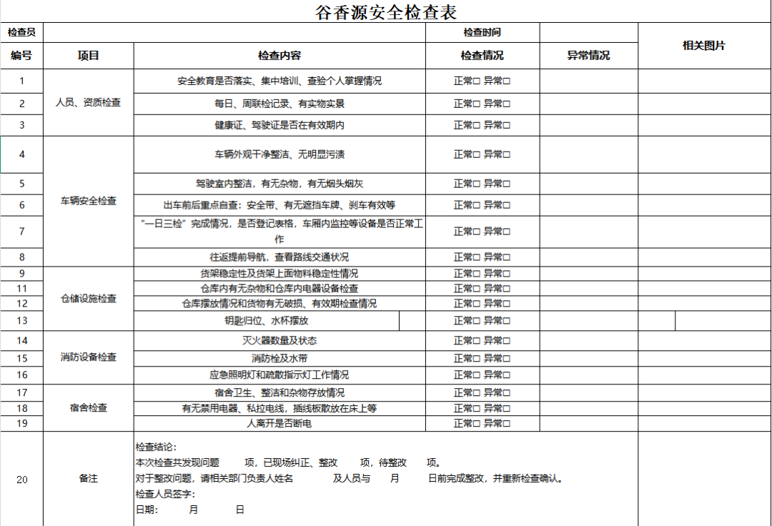 为了保证春节期间的安全运营,公司专门制作了每日安全检查表,指定体系安全部值班人员进行检查,做到“每日必查、每项必查、每人必查”,检查结果认真做好记录并发到群内。为了杜绝节日期间驾驶安全,早班对所有配送人员进行酒精检测,有异常禁止出车。