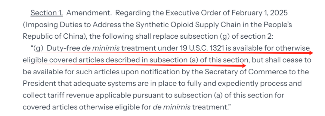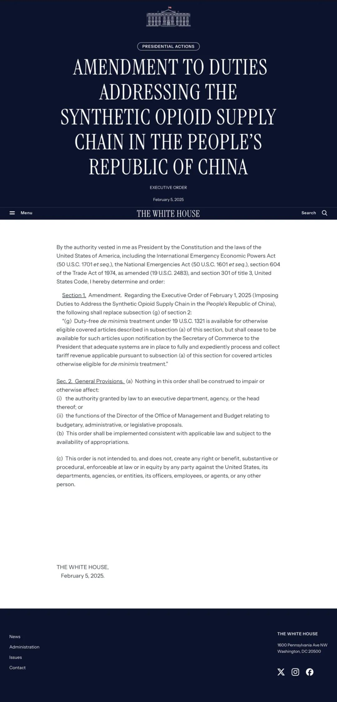 根据白宫新闻网站公告,新的行政命令暂时允许对中国包裹实行关税豁免,直到“商务部长通知总统,已建立适当的系统,来全面、迅速地处理关税收入”。目前,白宫没有给出具体实施时间表。