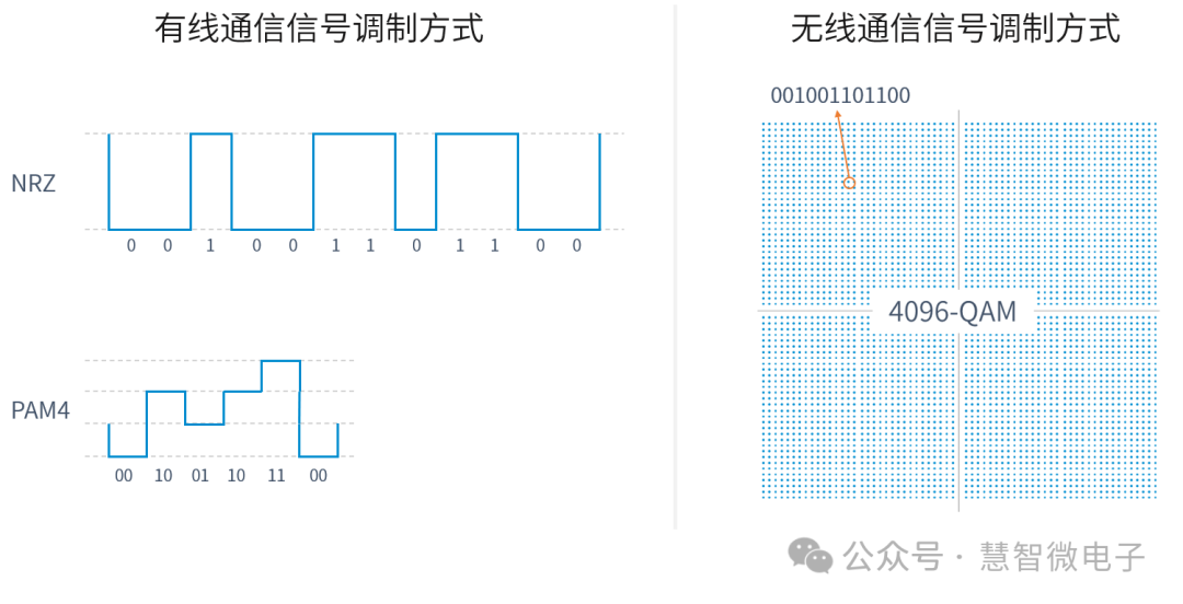 有线通信与无线通信由于传输媒介的不同,展现出截然不同的传输特性。在使用带宽、调制方式、传输速率这些与传输特性紧密相关的方面,两者存在显著差异。就使用带宽而言,有线通信能够利用的带宽范围广泛,可达几GHz甚至几十GHz。而无线通信虽然总频谱宽度也达到数十GHz,但由于需要与众多无线通信应用共享,因此单个通信技术下的单个用户通常只能使用几十MHz的带宽,甚至在一些频谱资源紧张的地区或运营商网络中,信号带宽可能仅限于几MHz。就调制方式来说,在无线通信中,频谱资源极为宝贵,因此调制方式成为了重点研究的领域,并取得了诸多改进。例如,最新的Wi-Fi7协议已经采用了4096QAM的信号调制技术,每个符号位可以携带12bit的信号信息。而在光纤通信中,广泛使用的仍是NRZ(非归零)和PAM4(四电平脉冲幅度调制)技术,每个符号位仅携带1~2bit的信号信息。此时,如果传递同样12bit的信息,NRZ和PAM4调制分别需要12个以及6个时钟周期传递完成,而4096QAM只需要1个时钟周期就可以传递完成。
