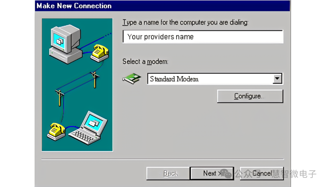 1969年,互联网概念初露端倪之时,全球有线电话网络已发展得相当完善。在大多数大型城市,电话线路已广泛覆盖,国家间也建立了国际长途电话线路和交换中心,实现了跨境通信。同时,电话通信技术日益成熟,不仅语音通信清晰,还具备了基本的呼叫控制和管理功能。正是得益于有线电话网络的硬件基础,在互联网开始普及的阶段,电话线因其广泛的分布和较高的可靠性,成为了实现信息互联的理想载体。利用已广泛铺设的电话线网络进行互联网部署,可以显著降低互联网建设的经济成本。于是,基于电话线的有线通信互联网逐步发展起来。早期,通过有线电话线进行有线网络连接时,数据需先转化为模拟信号进行传输,这一过程称为“调制”。数据到达接收端后,模拟信号再被还原为原始数据,这一过程称为“解调”。调制和解调的过程合称为Modem(中文译为“调制解调器”),也常被人们亲切地称为“猫”。在Windows早期的拨号界面中,还可以清楚的看到有线电话线实现的拔号网络拓扑结构。