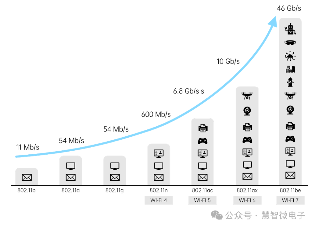 图:1999年苹果iBook发布中的经典一幕,乔布斯用呼啦圈证明笔记本的无线连接无线局域网(WLAN)实质上是有线互联网在终端接入段的延伸与补充。在有线网络广泛铺设的基础上,WLAN技术凭借无线传输的优势,填补了有线网络难以覆盖或不便布线的区域空白。它将有线网络的信号无缝传递至用户身边的每一个角落,为用户提供了便捷、灵活的网络连接体验。通过WLAN,用户可以摆脱线缆的束缚,随时随地畅享互联网服务,极大地提升了生活的便捷性和工作效率。随着科技的飞速发展,为了满足人类日益膨胀的数据传输需求,IEEE 802.11协议不断演进,从802.11a、802.11b逐步升级到802.11ac,再到如今的802.11ax(即Wi-Fi 6)以及最新的802.11be(即Wi-Fi 7)。每一次更新不仅见证了技术的巨大飞跃,更带来了数据传输速率的显著提升。从最初的几Mb/s跃升至如今高达46Gb/s的峰值速率,Wi-Fi正以前所未有的速度满足现代社会对高速无线通信的迫切需求。