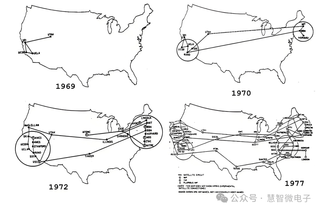 有线通信的研究与发展历史可追溯至200年前的19世纪初。1835年,塞缪尔·F·B·莫尔斯(Samuel F. B. Morse)成功研制出第一台有线电报机,标志着有线电报的诞生。相比之下,无线通信的首次应用则要到1900年前后,有线通信的发展因此领先了近一个世纪。有线电报发明后,迅速被应用于军事、民用等多个领域。1866年,横跨大西洋的海底电缆成功铺设,将欧美大陆紧密相连,有线电报通信因此成为全球性的通信方式。紧接着,在1876年,亚历山大·格拉汉姆·贝尔发明了世界上第一部电话,标志着电话技术的诞生。经过近百年的蓬勃发展,到20世纪中期,电话线路已在全球范围内普及,成为人们生活中必不可少的通信工具。图:20世界中期的电话广告,当时电话已进入寻常百姓家从1835年至1970年左右的这一百多年间,利用电报、电话的承载,人类逐步发现并在全球范围内应用了“有线通信”这一通信方式。而1970年之后,随着互联网的飞速发展,有线通信的发展踏上了高速车道。1969年,美国国防部国防高级研究计划署(DARPA)资助建立了名为ARPANET(阿帕网)的网络。ARPANET首次实现了计算机之间的互联,通过通信线路将不同地点的计算机主机连接起来。它被誉为世界上第一个计算机网络,也是今天因特网的前身,标志着计算机互联通信迈入了一个崭新的时代。图:最早的有线计算机网络ARPANET的诞生与发展计算机互联需要依赖传输媒介,在各种计算机高速互联需求的推动下,有线传输媒介开始迅速迭代发展。在过去的五十年里,随着有线通信速率需求的不断提升,以下几种技术方案得到了广泛应用: