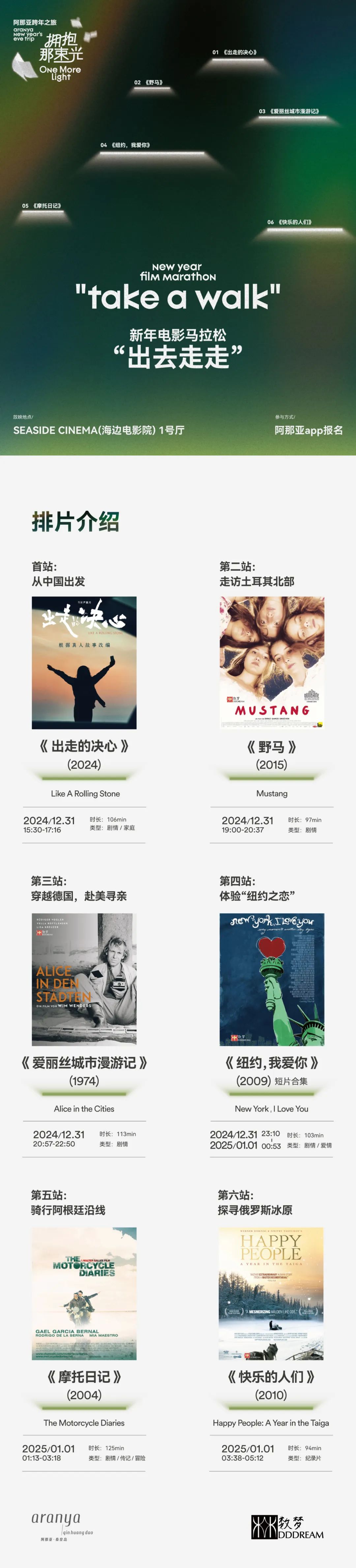 准备好了吗?当太阳落下,我们的冒险才刚刚开始。这个跨年之夜,一起踏上一场非凡的光影之旅——“出去走走”新年电影马拉松,来一次跨越时空、环游世界的奇妙冒险。六部电影,六段旅程,持续13+小时的马拉松式视听盛宴,电影成为连接过去与未来的桥梁,带我们穿越时空的海洋,徜徉于现实与虚构之间。从东方古韵到南美热土,从欧洲文艺到北美繁华,再去到极北之地感受原始呼唤。跟随光影,环游世界,让心灵在新的一年里,勇敢出走!《出走的决心》Like A Rolling Stone类型: 剧情/家庭