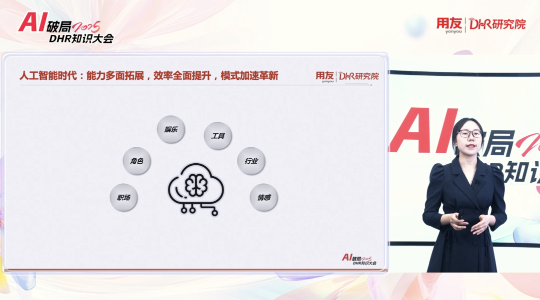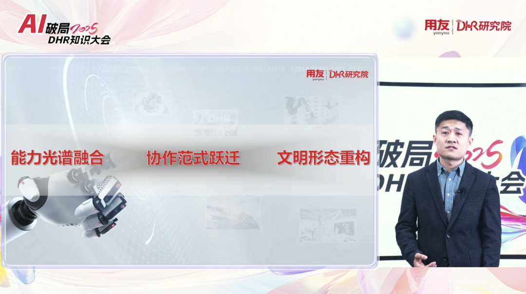 用友数智人力解决方案总监牛继善先生,为我们揭开《2025 AI+人力资源大变革:7大趋势重塑人才战争》!通过趋势预判,找准未来三年人才战略的决胜关键:”生成式AI正在重构人才供应链,不仅体现在对岗位职责和人才发现,人才评价的业务重塑上,更体现在生成式AI将以各种各项的形式进入职场,作为数字员工,重构企业内部硅基人和碳基人的共同生态。在未来,碳基人与硅基人将携手共进,催生出前所未有的创新成果,彼此赋能、相互成就。“