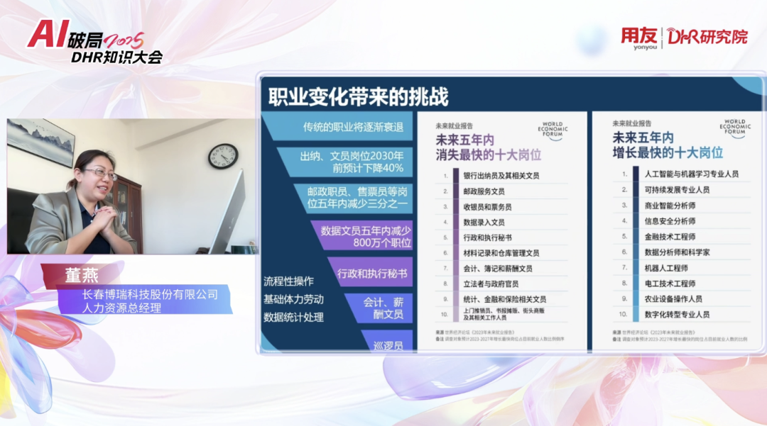 长春博瑞科技股份有限公司人力资源总经理董燕女士聚焦职场发展,分享了《拥抱职业变化开启职业新篇》的主题内容,表示:“数智化浪潮下,常规事务性岗位加速消失,新兴岗位不断涌现,这就要求从业者需要沿着 AI 和数智化方向上进行提升。根据自身工作情况思考职业定位和个人发展。”