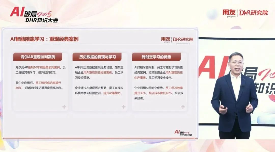 一点知识作为国内领先的新一代企业学习平台,本次大会特邀一点知识首席运营官展帮营先生带来《AI+企业学习:从填鸭式培训到智能陪跑学习》的内容分享。展帮营先生指出:“传统的填鸭式企业培训弊端重重,效率低下且成本高昂。当企业培训插上AI的翅膀,即会发生效率革命与成本重构。未来,AI 在企业培训中的应用将沿着个性化与智能化、跨领域融合、全球化与国际化的方向发展,显著提升企业创新能力、竞争力,助力企业更高效地达成战略目标 。