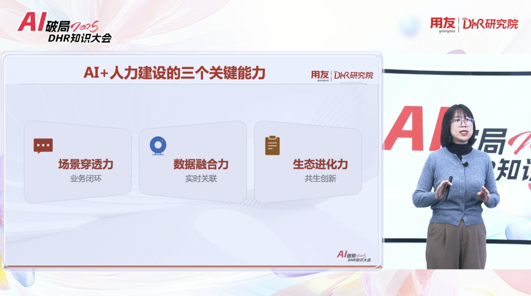 当全球化布局完成,组织性能提升如何实现,AI Agent或许正是那把钥匙。用友数智人力解决方案专家郑欣亚分享了《AI Agent时代 组织效能提升的新引擎》,她表示:“从经验驱动迈向智能决策,从被动响应转为主动干预,从标准流程升级为千人千面,企业想要真正地实现 AI 落地,需构建场景穿透力、数据融合力、生态进化力等关键能力,从需求分析、数据准备、模型定制等多步骤推进。AI呢不是不是替代者,而是摆渡人!那些率先实现人机共生的组织正在重新定义效能的边界,持续去推动业务的模式!”