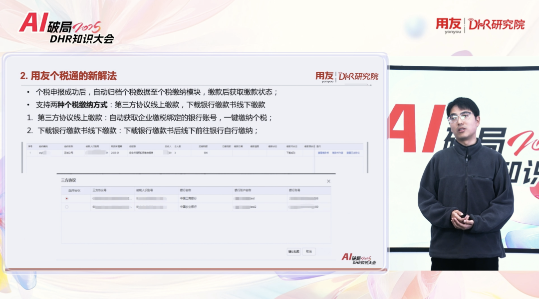 随后,用友集团旗下个税通产品负责人黄赛带来了《AI+个税通:智能驱动,企业个税管理新标杆》的主题内容演讲,他表示:“在AI技术的推动下,企业个税管理正迎来智能化转型。用友个税通通过连通企业人力资源系统与税务系统,后端对接税局金税系统,前端嵌入人力业务系统,实现了个税全流程的新接法。解码人效业绩增长无限可能,为更多企业实现收入稳定增长提供强有力的支持。”