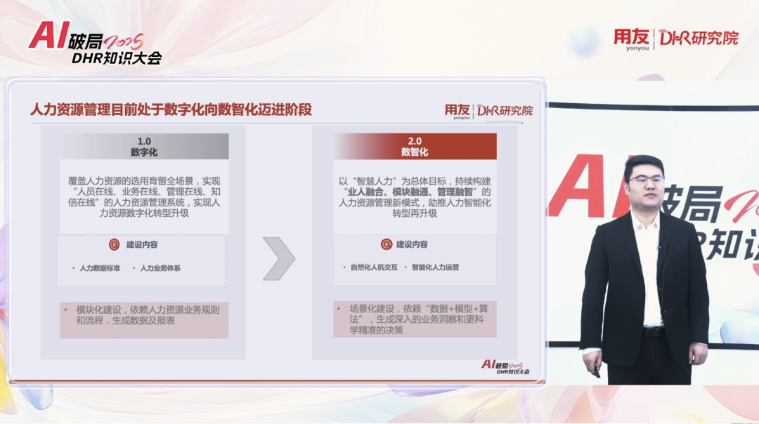 中国企业正在由浅入深积极利用AI实现业务升级,抢占技术红利带来的竞争优势。政策引导和企业实践相辅相成,共同推动我国人工智能领域向更高水平迈进。于此同时人力资源管理也正在经历从数字化向数智化的深度演进。用友数智人力解决方案专家郑百兴在《AI驱动的人力资源智能化转型:路径探索与实践指南》的分享中表示:“以“智慧人力”为目标,推动“业人融合、模块融通、管理融智”的人力资源管理新模式,依托“数据+模型+算法”实现场景化深度运营。通过自然化人机交互与智能化决策,形成业务洞察与精准管理能力,让人力资源管理真正迈向数据驱动的智能决策与价值创造时代。”